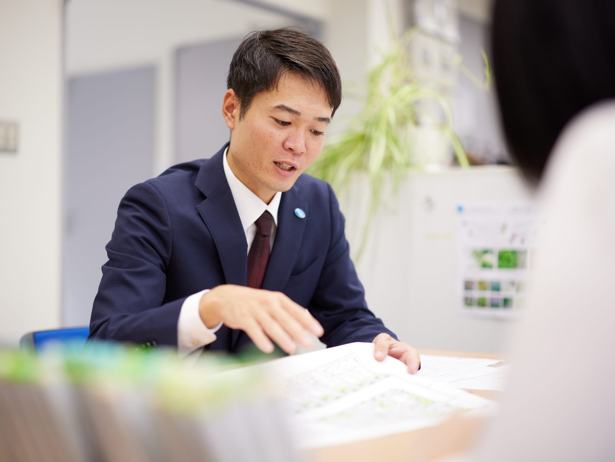 住宅事業課での業務は、案件に携わる全員が一丸となって取り組める環境が魅力です。設計担当として外構プランを作成する際も、施工の担当者とすぐに相談できる風通しの良さがあります。逆に、施工担当者やアフターメンテナンスの担当者からも気軽に意見や質問を投げかけてもらえるので、スムーズに業務が進みます。事業主の要望を形にするプロセスでは、敷地の条件や地域特有の要素を最大限に考慮し、まずは街全体のイメージを決めていきます。そこから、各住戸の植栽へと丁寧に落とし込んでいきます。この積み重ねが大きな達成感に繋がります。