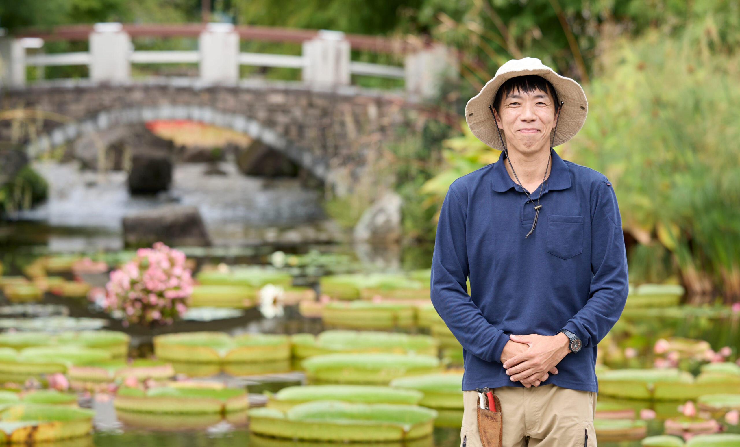 大阪経済法科大学法学部卒業後、地元のJAに入社。その後、公園の管理会社に転職して植物の維持管理に従事。2018年、さらに技術や経験の幅を広げたいと考え、西武造園に転職した。滋賀県の草津市立公園の植栽責任者を経て、2020年より草津市立水生植物公園みずの森の植栽責任者に着任。園内の草花や樹木の維持管理業務のほか、見頃の植物情報などを発信する公式Instagramの運営や掲示物の作成、植物イベントの対応なども行っている。