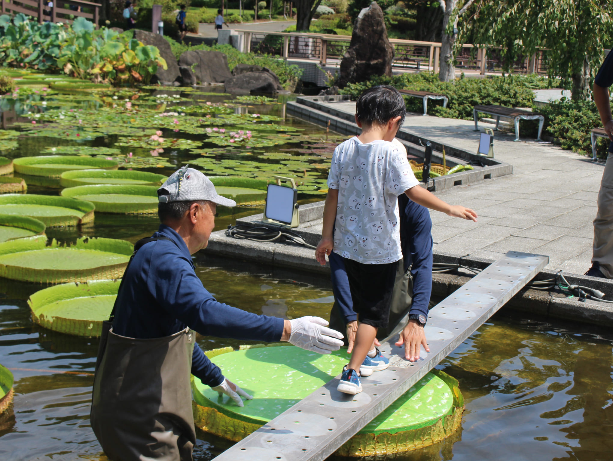 また、企画チームと協力しながら植物を活用したイベントを開催し、植物の魅力を体感していただき、感動や驚きを届けられることもこの業務ならではの醍醐味です。特に印象に残っているのは、夏に巨大な葉を水面に広げる「オニバス」の試乗イベント。私は池に入り、葉を支える役割を担当。初めは恐る恐るだった子どもたちが、実際に葉に乗る挑戦を通じて、最後には満足感や達成感があふれる笑顔に変わっていく様子を間近で見て、何度も胸が熱くなりました。また、Instagramで見頃の植物の写真を撮って投稿していますが、実際に来園された方から「投稿を見て来ました」と言ってもらえるのもやりがいを感じる瞬間です。「今きれいに咲いている花」を撮影するため、園内を駆け回った甲斐があったと感じます。
