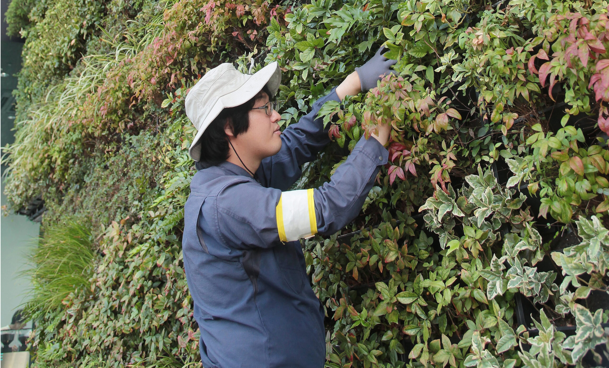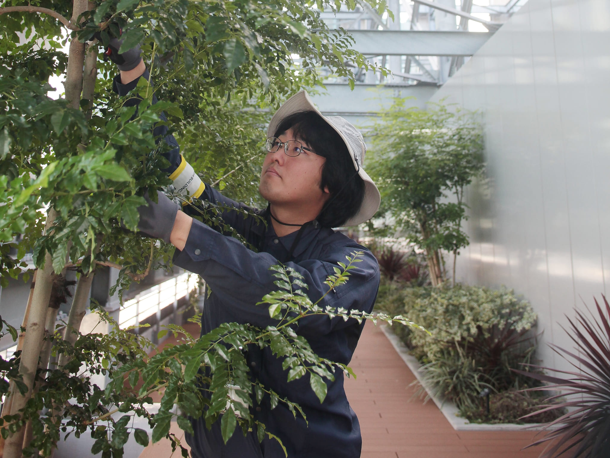 都内の商業施設やオフィスビル、マンションなど、建物の外構や館内、屋上に設置された植栽の維持管理業務を担当しています。季節ごとに変化する植物を美しいコンディションで維持するための作業や、植栽をより良くするために専門的な知見から改善提案を行うなど、快適なみどりの空間を創出する業務に携わっています。複数の施設を担当し、定期的な巡回で各現場をまわっています。基本的には外での業務がほとんどですが、都内の事業所で書類作業をしたり、部署の同僚と会議をしたりすることもあります。