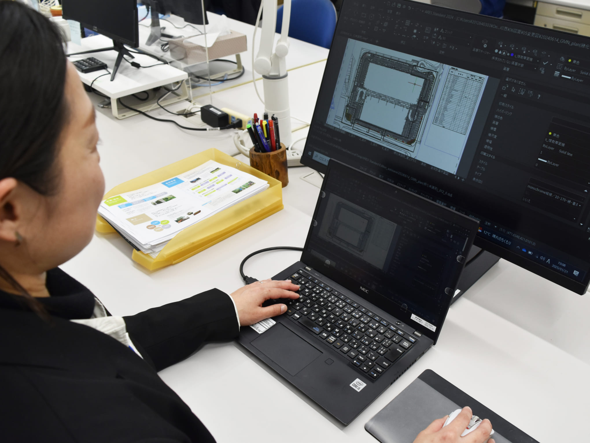 工事に関わるデータ整理や書類作成など、現場支援を行っています。みどり環境事業部は、工程の状況把握、ピークの早期予測、発注者などとの組織的交渉などを行うことで、現場業務の分担、効率化を推進しています。そのなかで私は、主に施工現場の長時間労働を抑えるためのサポートをしています。具体的には、工事の写真整理、設計図面などから数量を求める数量拾い、提案書類や出来高管理表の作成、施工体制台帳や安全書類の整備などが主な業務内容です。この他にも、部署では若手社員の技術研修などのサポートやDX技術の導入による業務効率化の取り組みなども行っています。