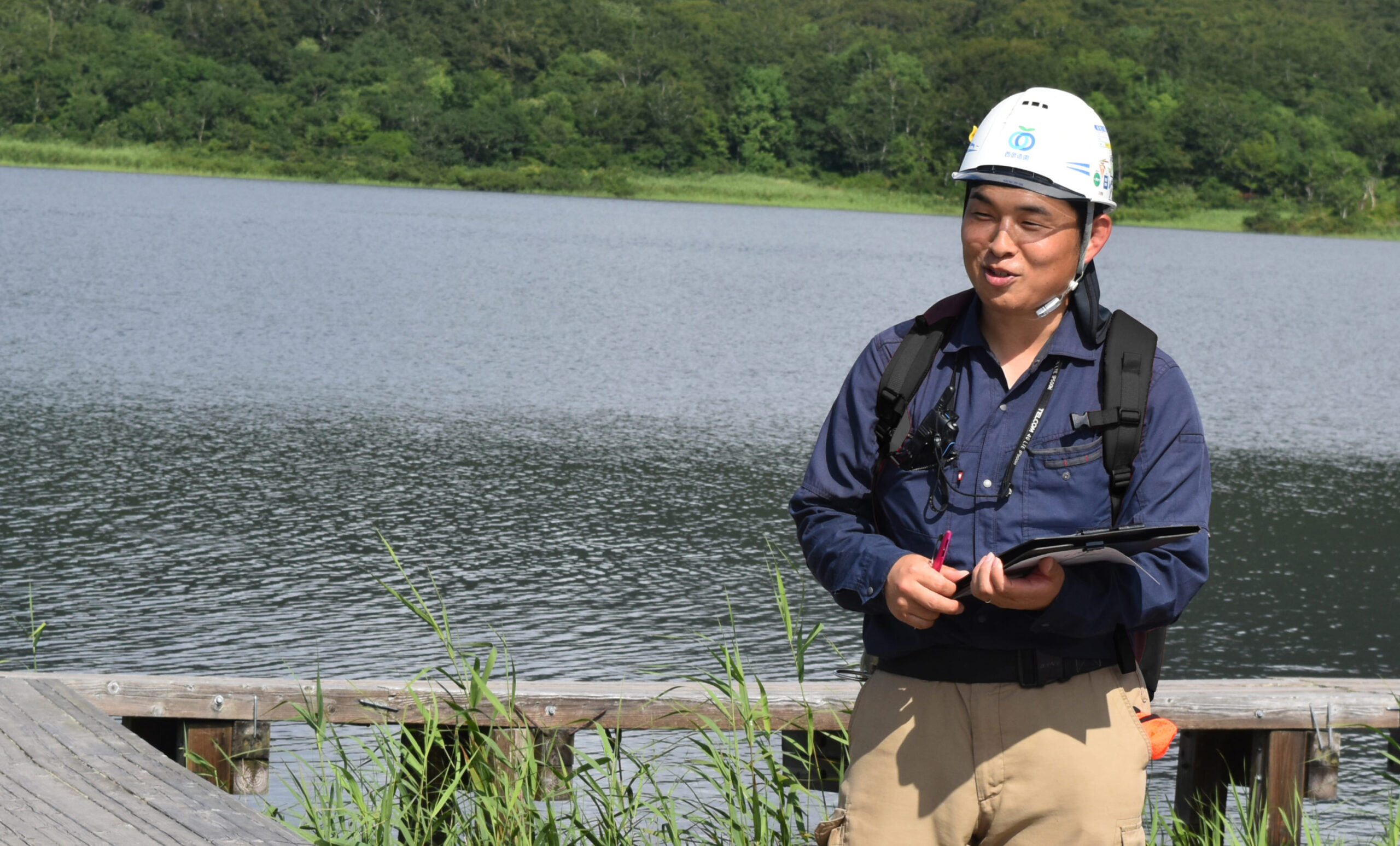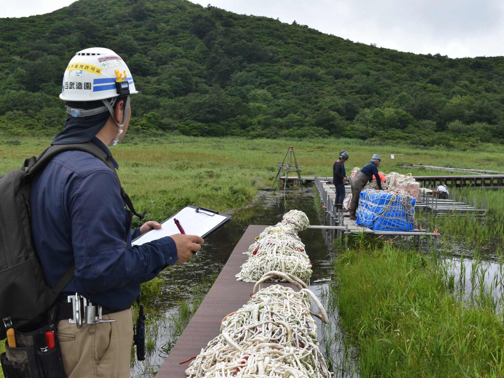 国の天然記念物にも指定されている湿原植物群落において、来園者の散策用園路の再整備工事に携わっています。標高が高い山間僻地のため、工事用の大型車両が通行できない区画があり、環境負荷低減に最大限配慮した工事を行っています。時には人力による資材運搬や、ヘリコプター等なども駆使して、工事資材の搬出入を実施しました。過去に他の現場では、工事用モノレールを活用したこともあります。山間部の現場では、都心部の施工現場とは環境条件等も大きく異なるため、天候等の影響を受けたりと苦労することも多いですが、そのぶん経験を積むことができ、やりがいにもつながっています。