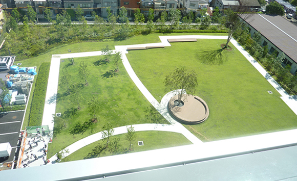 外周部はしっかりとした幅員の緑地を設け、内部には明るく開放的な芝生広場が広がります。