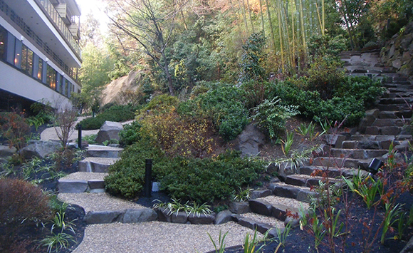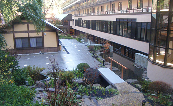 植栽も箱根山にふさわしい樹種を選択し、室内の各フロアーや家族風呂には人工樹木や瓦、砂利等を配置した坪庭を施工しました。また旧庭園の蹲を滝の受石に利用するなどの工夫により新旧の調和を図っています。