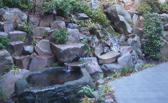 旧稲葉氏の別荘跡地にあった温泉宿の庭園改修工事を主とし、既存散策路や滝などの自然修景を生かした庭園整備、流れや石積みを新設することで現在にそのすばらしい水系を多く取り入れた庭園を蘇らせました。
