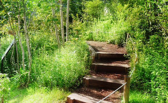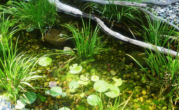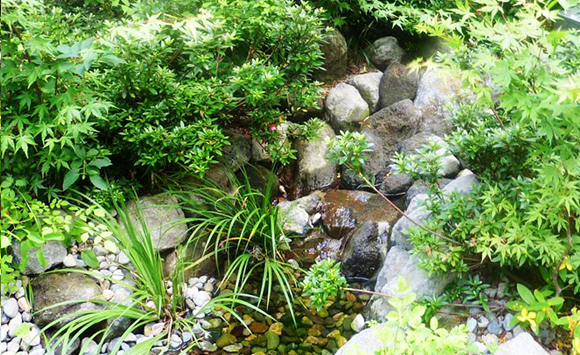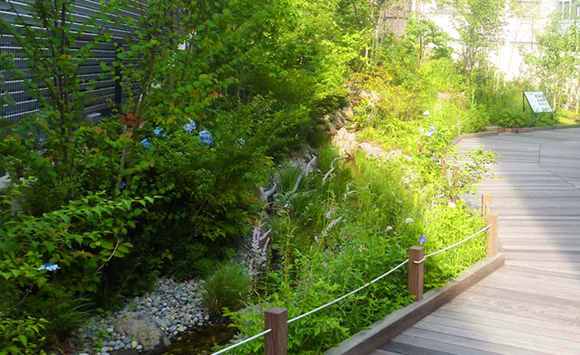 上流域から下流域にかけて微妙な樹種構成に変化を持たせた植栽計画により、都会の中で鳥や蝶のよりどころとなっており、池にはめだかが泳ぎ、買い物客のみならず近隣の人々にも、落ち着きのあるほのぼのとした空間を提供しています。
