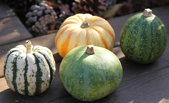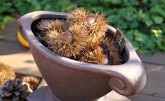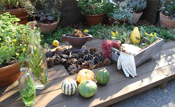 紅葉した葉の景色と、ゲッケイジュの列植による緑の壁の色の対比や、色々な葉から香る匂い、色とりどりの鉢植えは植物のもつ機能をライフスタイルにとり込み、緑のインテリアとしても楽しめるように、室内外一体の庭空間を演出しています。