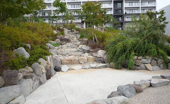 普段は憩いやレクリエーションの場として利用され、災害時は一時避難や救援活動の拠点となるよう様々な施設が整備されています。延べ2年半の施工期間をかけ、地下埋設防災施設、造成、給排水設備、擁壁、園路広場、舗装、大径木移植、ビオトープを含む水景施設、遊具施設、防火樹林帯や修景植栽、照明などの多様な工種を一貫して施工しました。