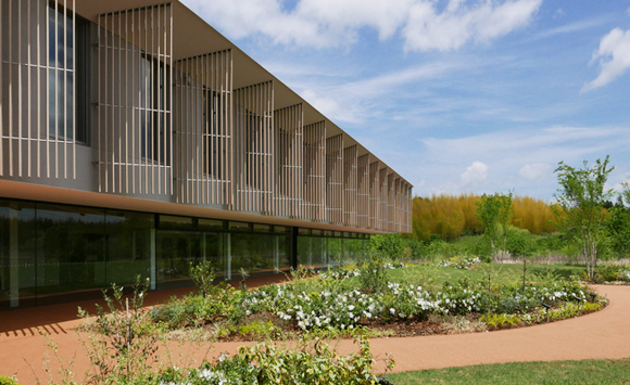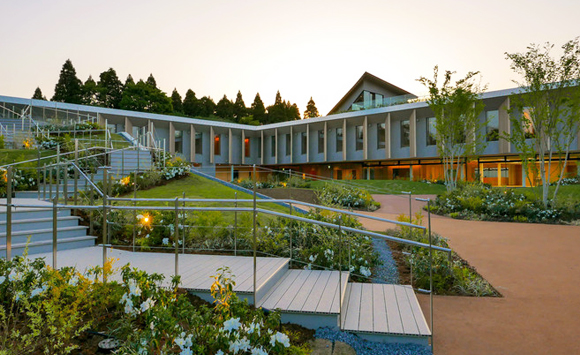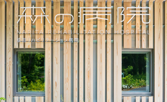 成田空港至近の森の中の低層リハビリテーション病院。外構から2階屋上へ緑が途切れることなく緑地を設置し、周囲の森と融けあう風景となっています。
