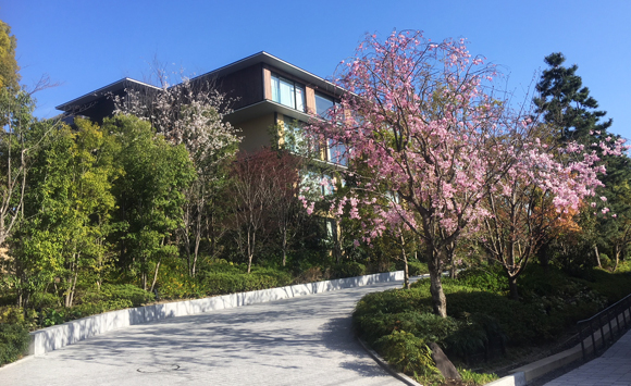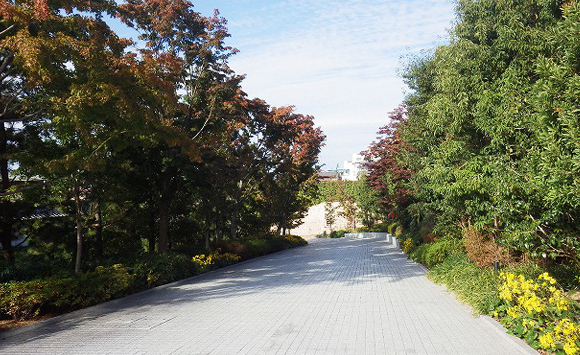 入口のモミジによる景観と奥行きのあるマダケの参道や、池泉を眺める庭園の散策路、メインシンボルのクスノキを中心におごそかさと静寂さのある枯山水庭園、ホテルレジデンス側エントランスのサクラやモミジによる四季の変化を楽しめる車寄せアプローチなど、美しい庭園の景観を常に保っています。
