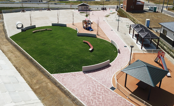 鹿折・南気仙沼地区の復興事業は震災直後からスタートし、土地の区画整理による公共施設や住宅地の再編が行われてきました。当社で、復興住宅に隣接する公園の整備を行いました。