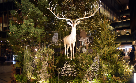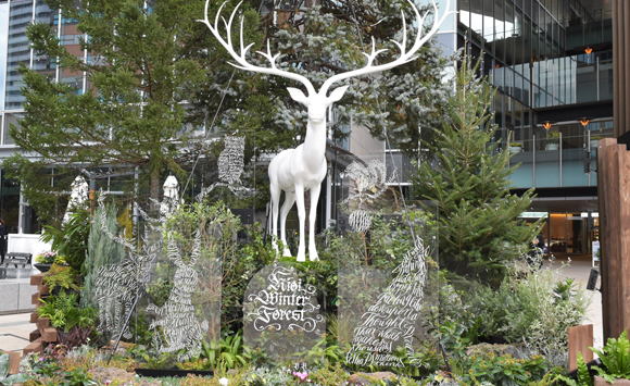 人や自然を大切に思う豊かな心を表現したツリーアートとなっており、冬の森に住む動物たちをモチーフにしたアートカリグラフィーのオブジェが配置されています。このオブジェは、アートカリグラファーと空間デザイナーのデザインユニット『fRAum®︎(フラウム)』による制作で、自然の樹木と美しく調和しています。