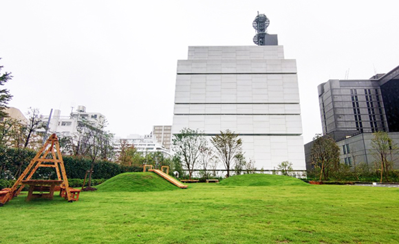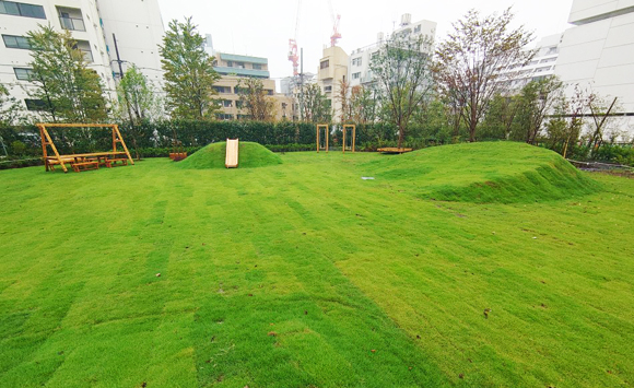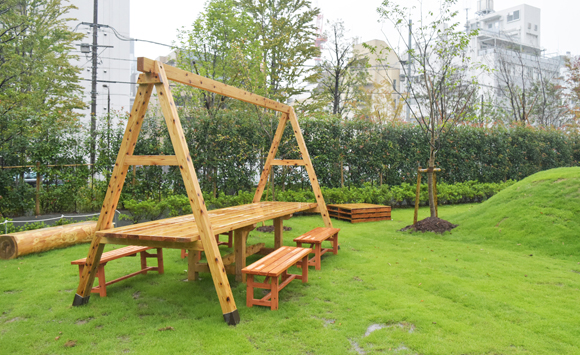 芝生広場には特徴的な斜面を設け、国産材を使ったベンチやブランコなど、木のぬくもりを感じながら子ども達が楽しめるよう工夫しました。また、近隣の「番町の庭」と揃えた七宝模様のフラットスペースを備え、キッチンカーやマルシェの誘致、地域の夏祭りなどアフターコロナの様々なイベントにもご利用いただくことができます。