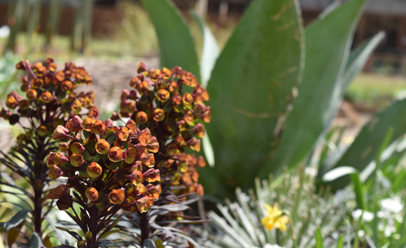 亜熱帯植物を取り入れながら、ロングライフ・ローメンテナンスのコンセプトに合う宿根草など合計40種以上を植栽。気温の上昇とともに成長し、続々と見頃を迎えます。