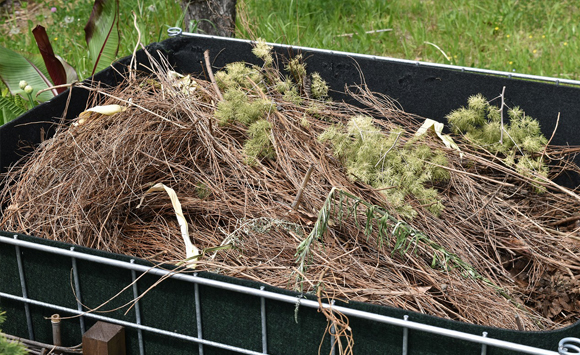 コンポストとバイオネストを使って、ガーデン内の枯れ葉や枝、花殻などを堆肥化し、還元します。大きな鳥の巣のようなバイオネストは、昆虫やミミズなどの分解者の住処の役割も果たしています。